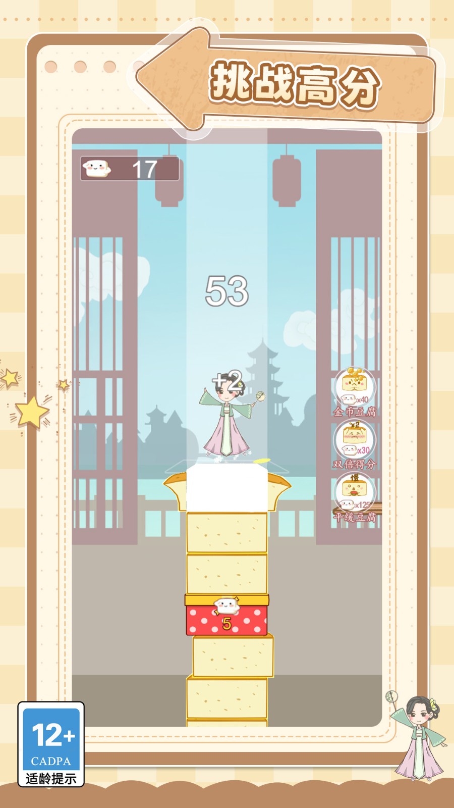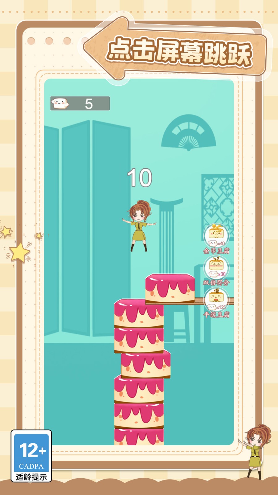 2、每一次豆腐出来了的时候,你要快速点击屏幕让萌妹跳跃起来,然后获得积分。