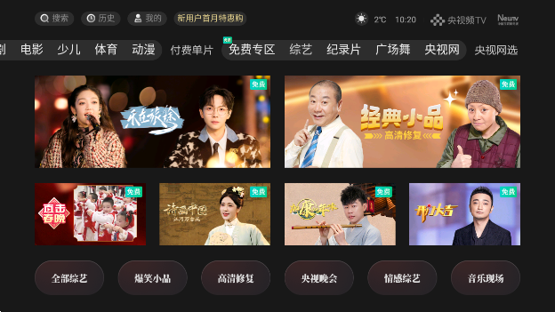 1.综艺:相声小品、情感相亲、音乐现场、央视巨制