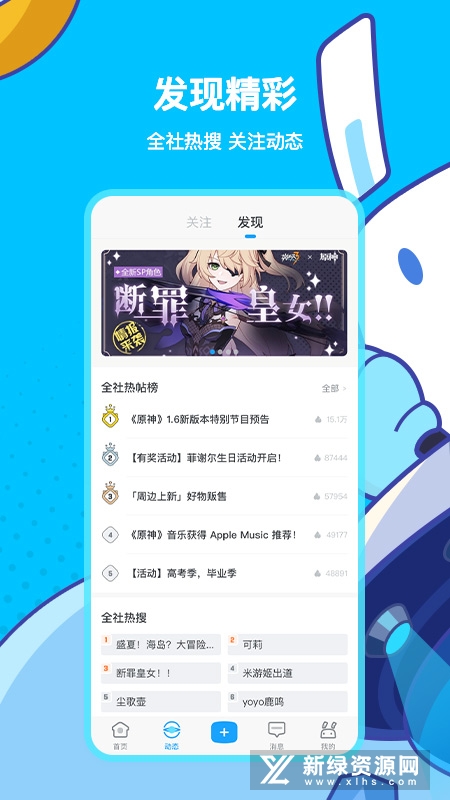 米游社客户端APP是米哈游论坛app,内置官方游戏社区,APP为玩家带来崩坏三,原神等热门游戏资讯内容、趣味八卦,你可以和其他玩家一同参与话题,分享技巧,尽情的吐槽,下载体验吧!