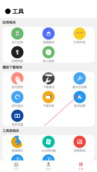 2、在【工具】页面的【播放下载相关】区域,找到【歌词设置】选项并点击,可进入歌词参数调整界面。