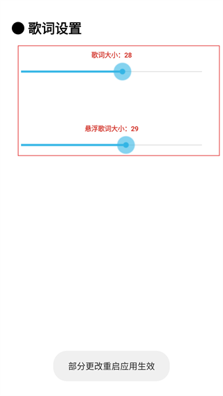 4、拖动滑块将【歌词大小】调至28、【悬浮歌词大小】调至29,部分更改需重启应用后生效,以优化歌词显示效果。