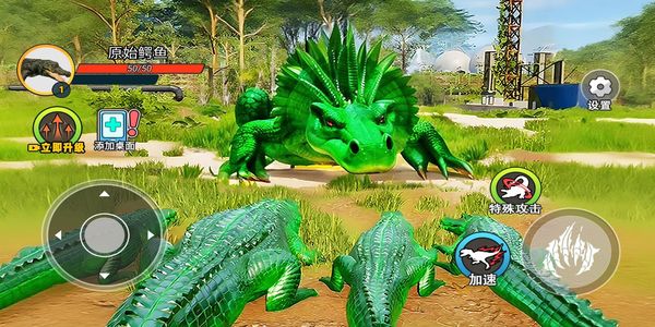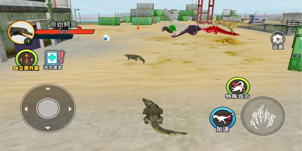 1、操控移动按钮控制鳄鱼在场景内移动,调整位置靠近目标,以便后续进行觅食或攻击等操作,探索场景内的区域。
