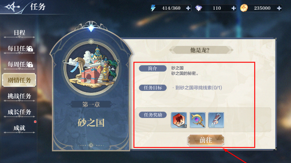 1、在任务界面选择【第一章-砂之国】的【他是龙?】任务,点击【前往】按钮,开启砂之国的线索寻找之旅。
