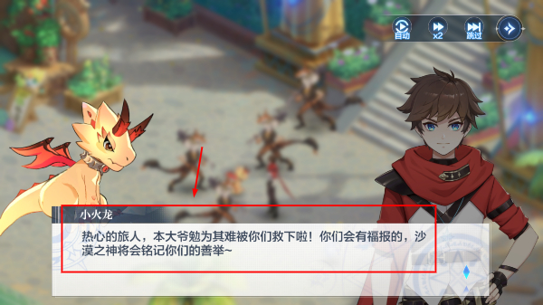 2、与【小火龙】对话,了解被救下的剧情,知晓沙漠之神会铭记善举,推进当前任务流程。