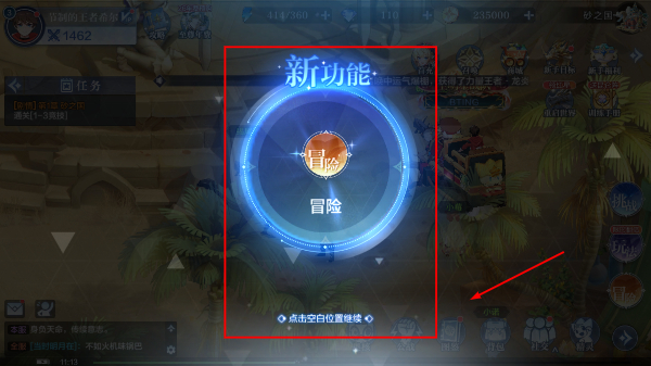 4、遇到【新功能-冒险】弹窗,点击空白位置继续,解锁相关冒险内容以推进游戏进程。