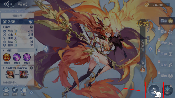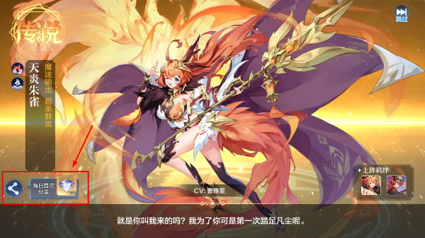 1、进入角色界面点击【每日分享】领取钻石奖励,可用于提升【天炎朱雀】的属性与技能等级增强战力。