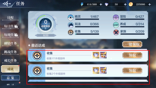 3、打开任务界面点击【一键领取】或对应【领取】按钮,获取收集任务奖励推进游戏进程与角色养成。