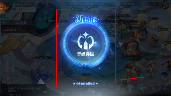 2、触发【新功能】等级突破系统,按提示完成任务解锁权限,助力精灵突破现有等级上限。