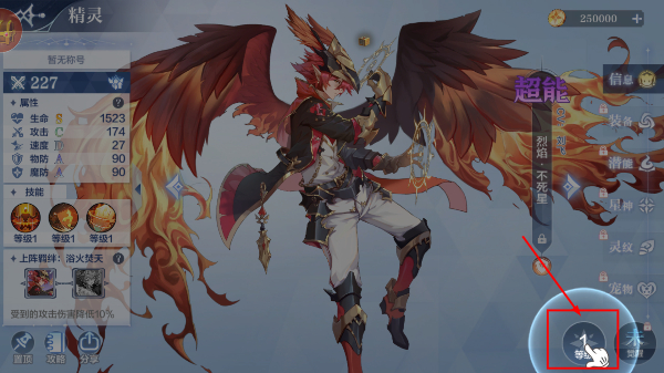 3、进入【烈焰·不死星】精灵界面,点击右下角对应按钮,可管理精灵的技能与专属特性。