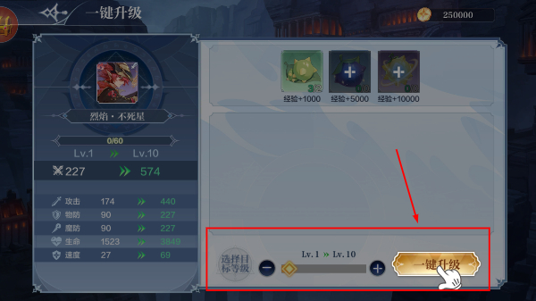 4、使用【一键升级】功能选择对应经验道具,能快速提升精灵等级,节省养成时间。