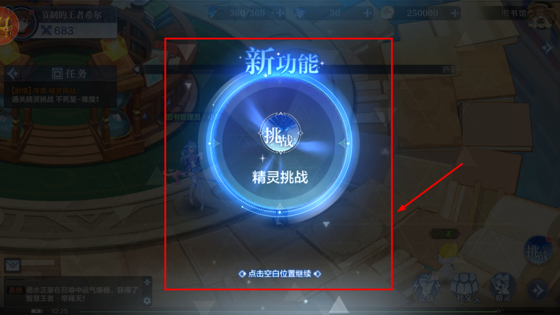 3、遇到【新功能】提示点击空白处继续,开启【精灵挑战】玩法解锁后续战斗内容。