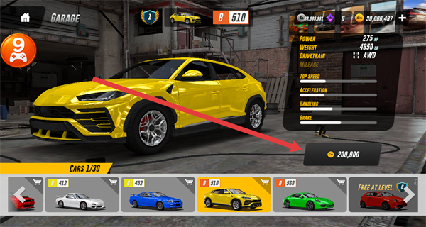 2、在车库界面中,选择心仪的车辆如黄色车型,消耗对应金币完成车辆更换。