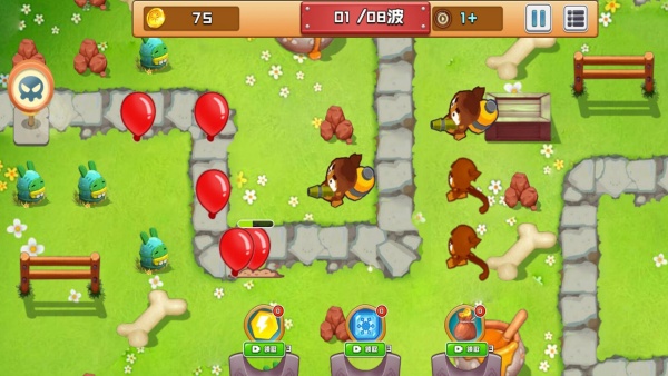 3、合理搭配不同类型的猴子塔,例如,用胶水猴减缓气球速度,用飞镖猴进行快速点射,用炮塔猴进行范围轰炸。