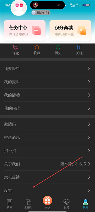 2、在个人中心,找到并点击【设置】选项,进入设置界面。