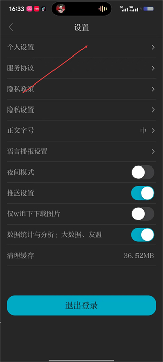 3、在设置界面,选择【个人设置】,进入个人资料页面。
