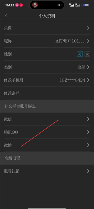 4、在个人资料页面,找到【社交平台账号绑定】板块下的【微信】选项,点击后按提示完成微信账号绑定操作。