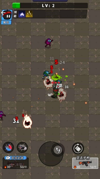 2、进入随机生成的地下城关卡,通过虚拟摇杆控制角色移动,并自动向最近的敌人持续开火射击。