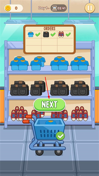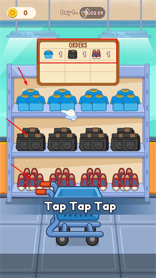 2、根据指引依次点击货架上对应的蓝色上衣、黑色包、红色鞋子,完成订单物品的选取操作。