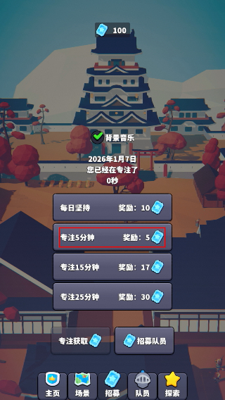 1、在专注界面选择【专注5分钟】选项,完成对应时长专注可获取资源。