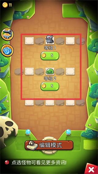 91、在编辑模式下,点击【小狗莫卡-等级1】或【乐乐-等级2】怪物,消耗【5】金币可查看其更多资讯,优化防御配置。