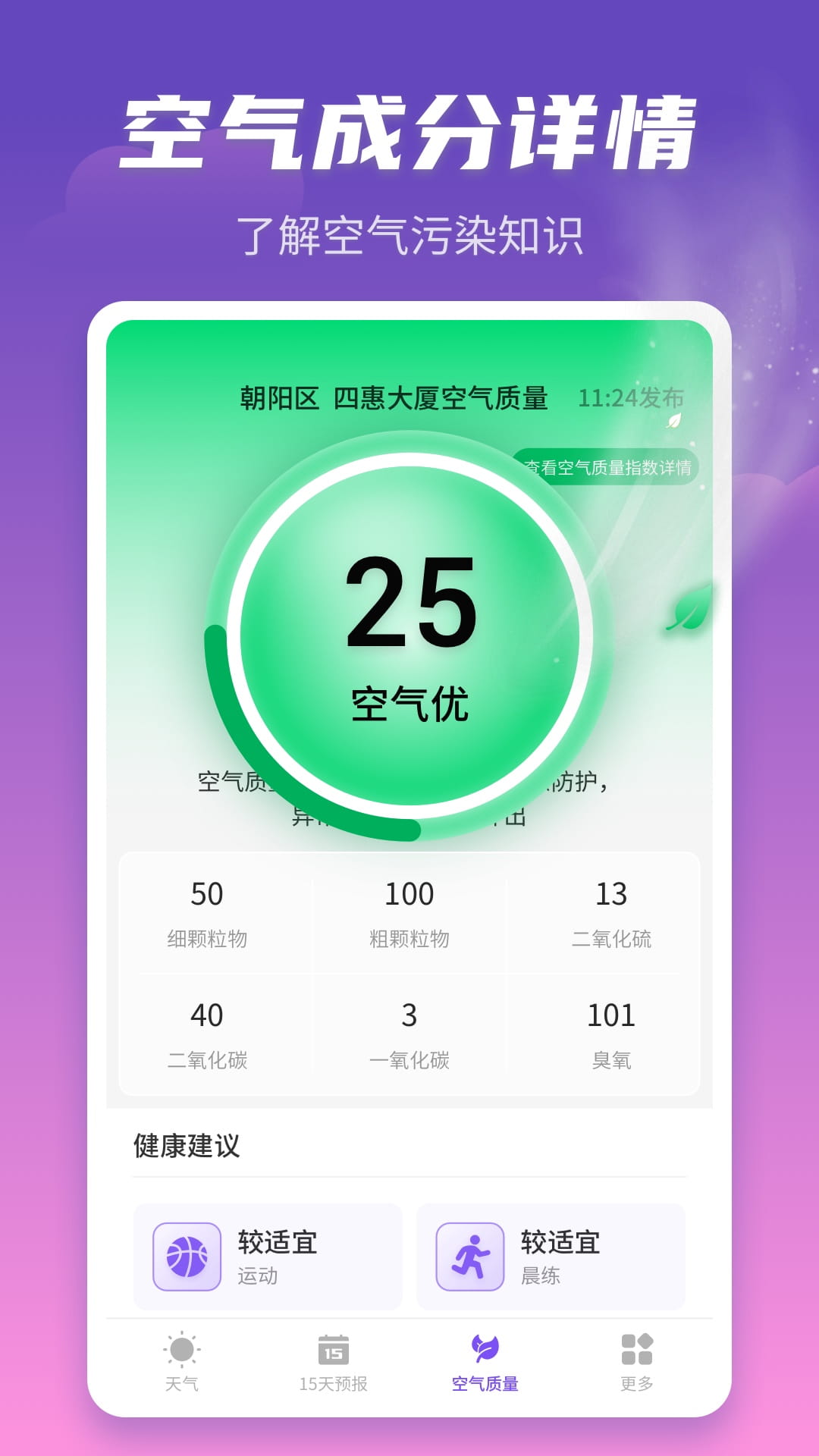 顺意天气是一款天气预报应用,它提供了实时的天气信息,包括温度、湿度、风速、空气质量等。用户可以随时随地查看自己所在地区的天气情况,还可以获取到未来三天的天气预报。此外,顺意天气还提供了一些实用的生活指数,如穿衣指数、紫外线指数、运动指数等,方便用户更好地安排自己的生活。