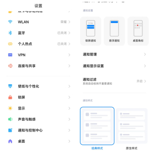1. 进入【通知与控制中心】-【通知显示设置】,切换为原生样式,方便后续操作。