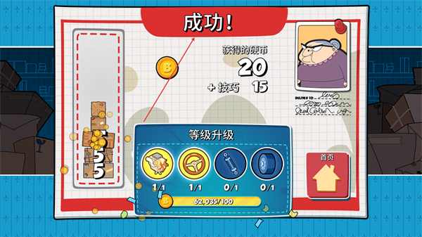 4、完成配送后显示成功界面,获得20金币与15技巧,解锁等级升级。