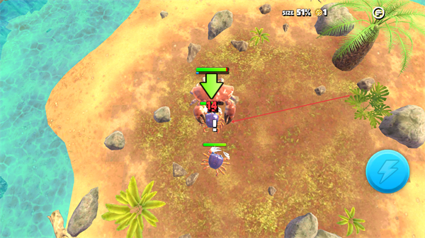 2、持续攻击小生物,积累数值,让螃蟹体型逐步变大,增强战斗力。