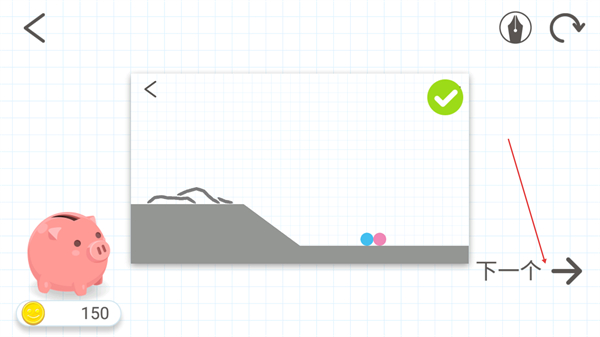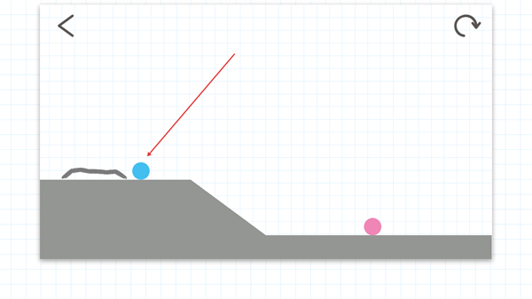 1、观察蓝色球与粉色点的位置,按红色箭头提示,在蓝色球下方的斜坡区域绘制辅助路径。