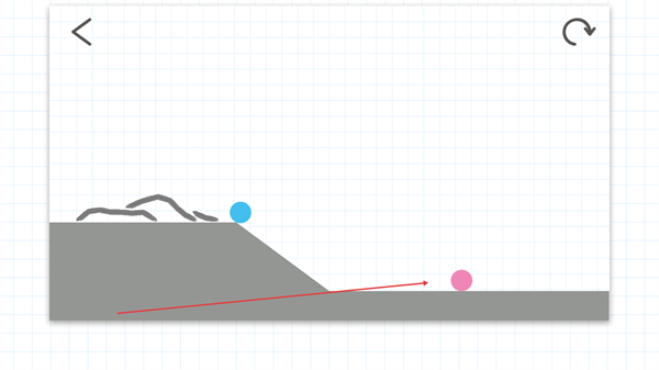 2、沿红色箭头方向,在斜坡与粉色点之间绘制平滑线条,搭建蓝色球的滚动轨迹。