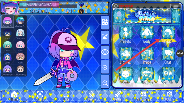 2、在Gacha-Star角色编辑界面,点击右侧菜单栏的Head选项,进入头部装扮设置页,可调整发型、头饰等外观。