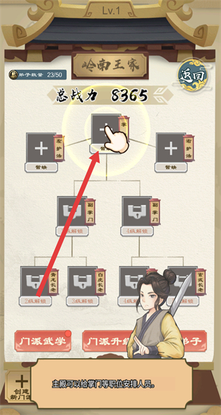 3、在主殿界面,点击掌门职位对应的空位,进入职位调整界面,准备为门派核心职位配置人员。
