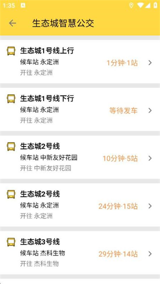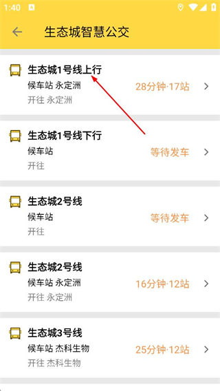2、在公交页面,点击生态城1号线上行对应的条目,进入该线路的详情页面。