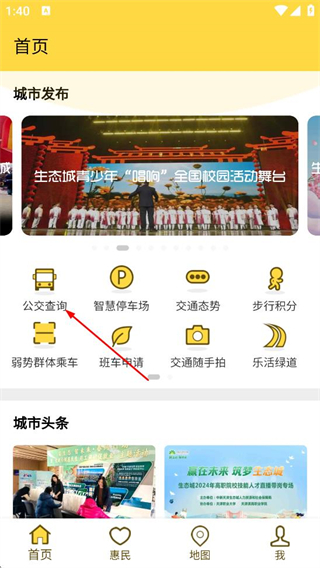 1、在应用首页,点击公交查询选项,进入生态城智慧公交的线路列表页面。