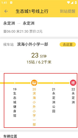 3、在生态城1号线上行的详情页面,可查看该线路的站点、到站时间、票价等信息。
