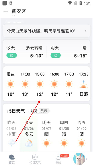 2、向下滑动页面,能查看当日分时天气,以及15日天气趋势。