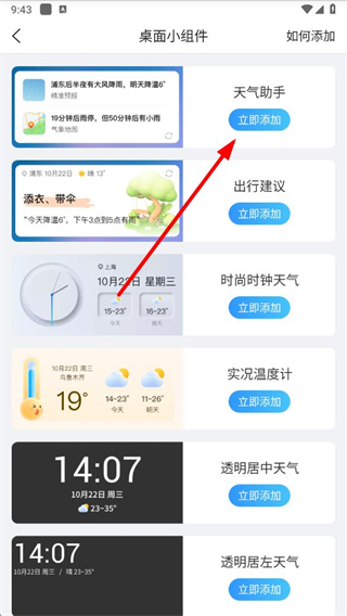 3、进入桌面小组件页面后,选择想要添加的小组件,点击立即添加按钮。
