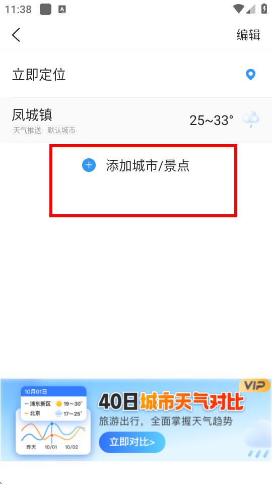 1、打开天气预报应用进入相关界面,点击添加城市/景点选项。