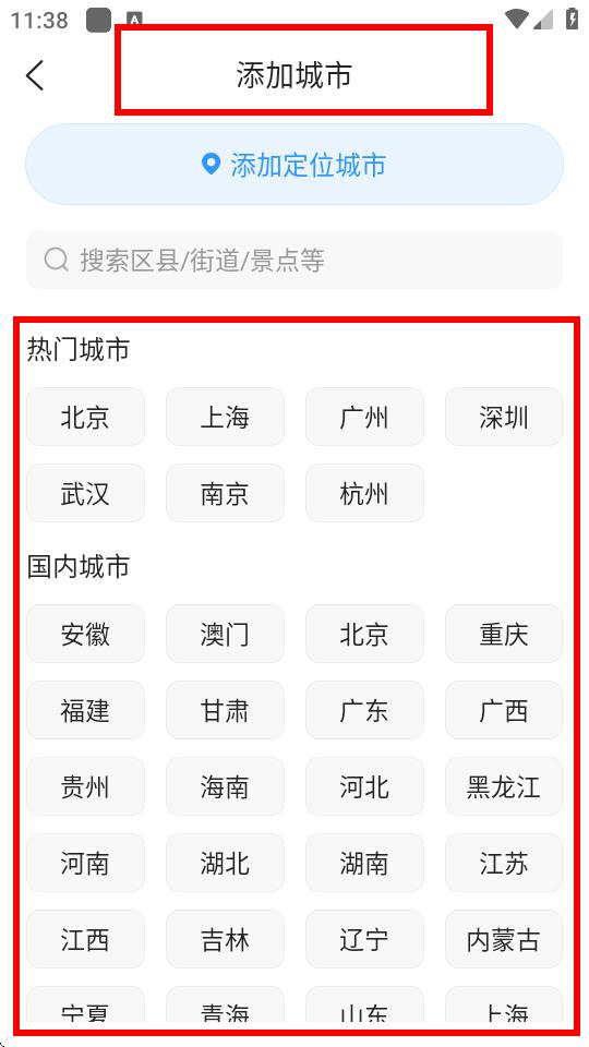 2、进入添加城市页面后,可点击添加定位城市,也可以在热门城市或国内城市列表中选择想要添加的城市。