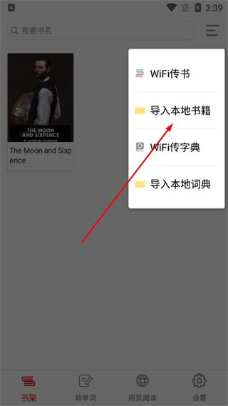 2、在弹出的菜单中,选择导入本地书籍选项,进入文件选择界面。