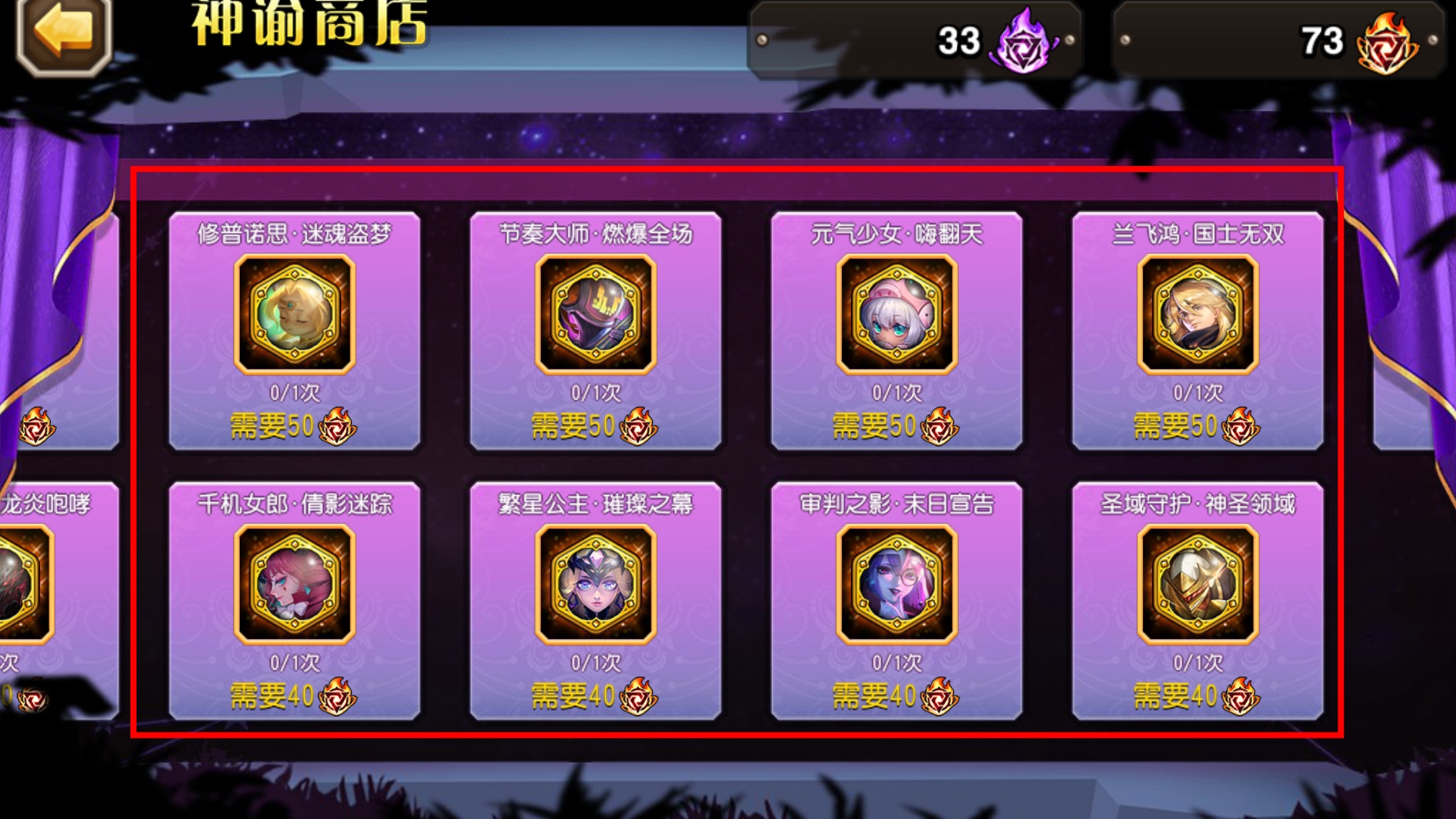 2、在神谕商店中查看各商品需求,如【修普诺斯·迷魂盗梦】需50道具,【千机女郎·倩影迷踪】需40道具,选择目标。