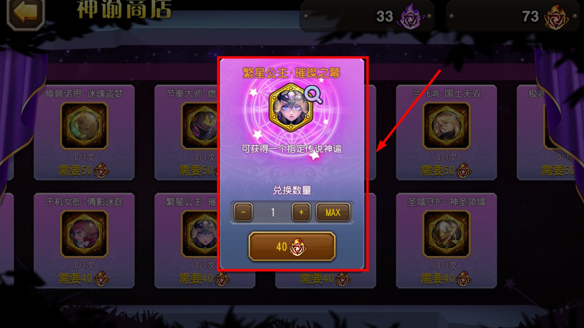 3、点击【繁星公主·璀璨之幕】商品,确认兑换数量为1后,消耗40道具兑换,获取指定传说神谕。
