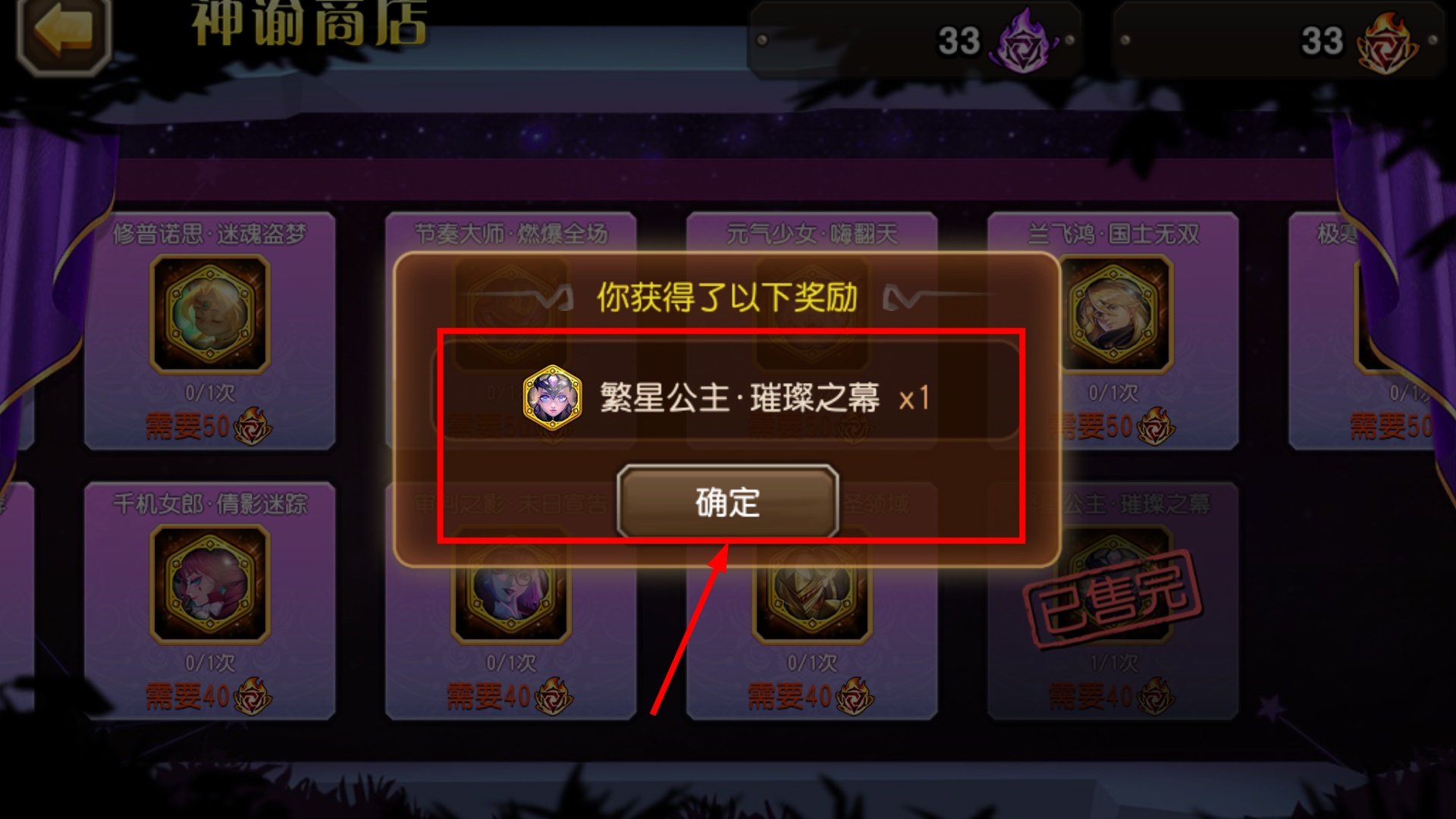 4、兑换成功后弹出奖励提示,显示获得【繁星公主·璀璨之幕】x1,点击确定关闭提示完成本次兑换流程。