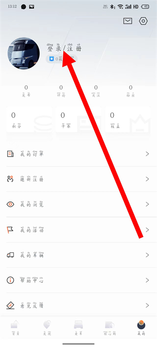 2、在个人页面,点击登录注册区域,进入登录界面。
