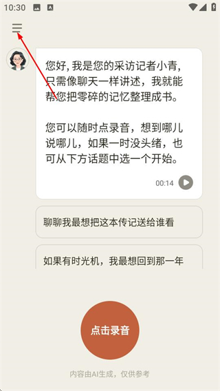 山顶传记是一款通过深度对话引导用户记录与梳理个人生命故事的创作工具,精心设计了近四百个涵盖成长、情感、事业与哲思的引导性问题,通过智能化的聊天式采访,协助您循序渐进地回顾与讲述人生篇章,您可以随时开启或暂停这场与自己的对话,每次完成的章节都将被智能梳理成一篇结构完整、情感饱满的叙事文章。