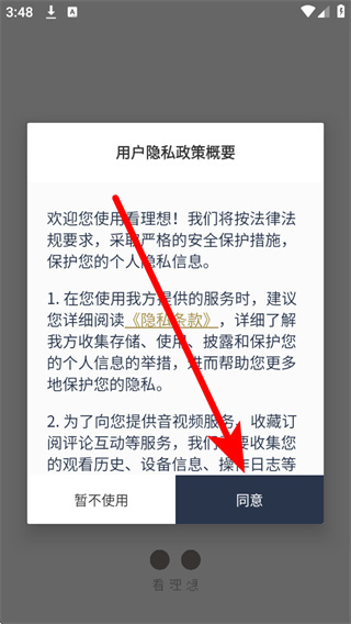 1、打开看理想后,弹出弹窗,点击同意,进入主界面。