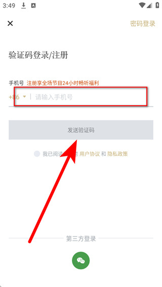 3、在该页面的手机号栏填写你的手机号码,勾选相关协议后,点击发送验证码。