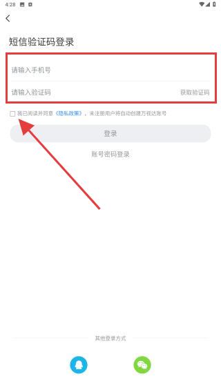 3、进入短信验证码登录页面,输入手机号,点击获取验证码,填写收到的验证码,并勾选我已阅读并同意隐私政策。