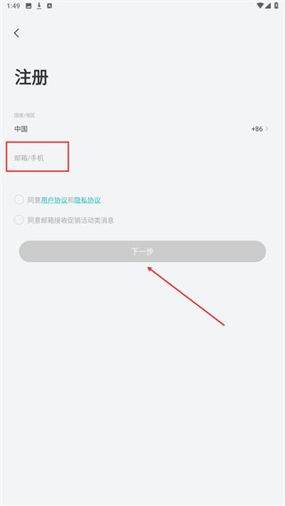 2、在注册的页面内,输入手机号后点击下一步的按钮。