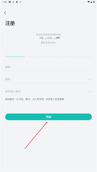 3、将收到验证码输入其中,再输入昵称密码后点击完成。